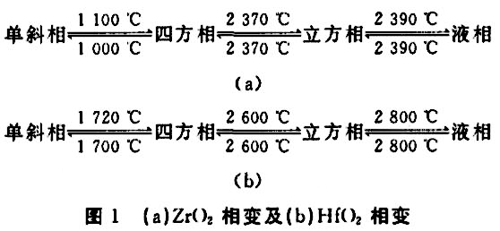 關于相變增韌的研究主要是圍繞ZrO2的相變特性展開的,是通過控制燒結工藝使內部的微觀組織產生增韌相,消耗裂紋擴展所需能量的同時造成相變體積膨脹促使其它裂紋閉合,是一種自增韌過程。以ZrO2和HfO2為例,隨溫度變化會發生以下同素異構轉變: