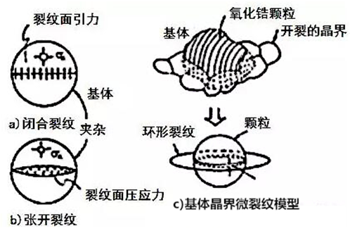誘發微裂紋增韌主要有三種方法:1、完成燒結后,溫度降低過程中,自然產生;2、燒結溫度過高,晶粒異常長大,產生微裂紋;3、材料受到外界應力作用。然而微裂紋增韌只增加了陶瓷集體的韌性,而對其強度是有很大的影響的,因此實際操作中,應適當控制微裂紋的產生。