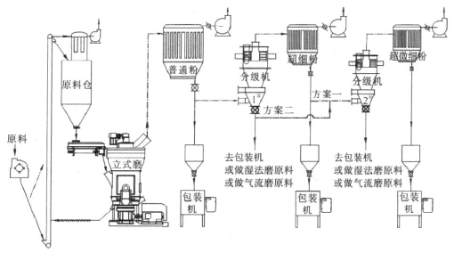 目前,重鈣加工企業多采用立式磨、球磨機和雷蒙磨等裝備,雷蒙磨適宜400目以下粉體的加工,球磨機較適宜800~1250目超細粉體的生產。立式磨適宜1250目以下非金屬礦粉體的規模化加工,其規模化和節能效應顯著,在很大程度上實現產品的精細化生產的同時,具有操作簡單、維護方便、工藝布置簡單、占地面積小、土建投資低、噪音小、環保性好等優勢。立式磨裝備及其技術已成為當下重鈣等非金屬礦粉體加工技術研究的新進展之一。