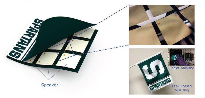為了展現揚聲器的效果,研究人員在一面學校校旗中嵌入FENG結構,并在iPad上透過放大器串流音樂至校旗,然后再完美無瑕地轉錄成聲音。Sepulveda說:“旗子就變成了揚聲器。因此,未來我們可用這種極輕薄、軟性的小型組件來取代尺寸較大、笨重且功耗大的揚聲器。”