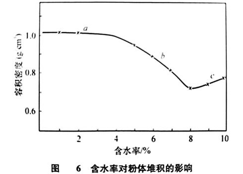 除此之外,潮濕物料由于顆粒表面吸附水,顆粒間形成液橋毛細力,而導致粒間附著力的增大,形成團粒。由于團粒尺寸較一次粒子大,同時,團粒內部保持松散的結構,致使整個物料堆積率下降。
